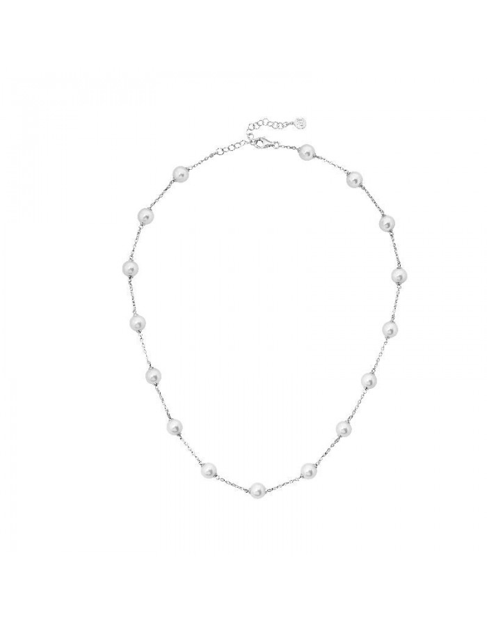 Collar con perlas hecha en Plata de Ley y con acabado en Rodio de la marca Majorica con cierre de mosquetón, el largo de la pieza es de 45 cm con extensión a 50 cm