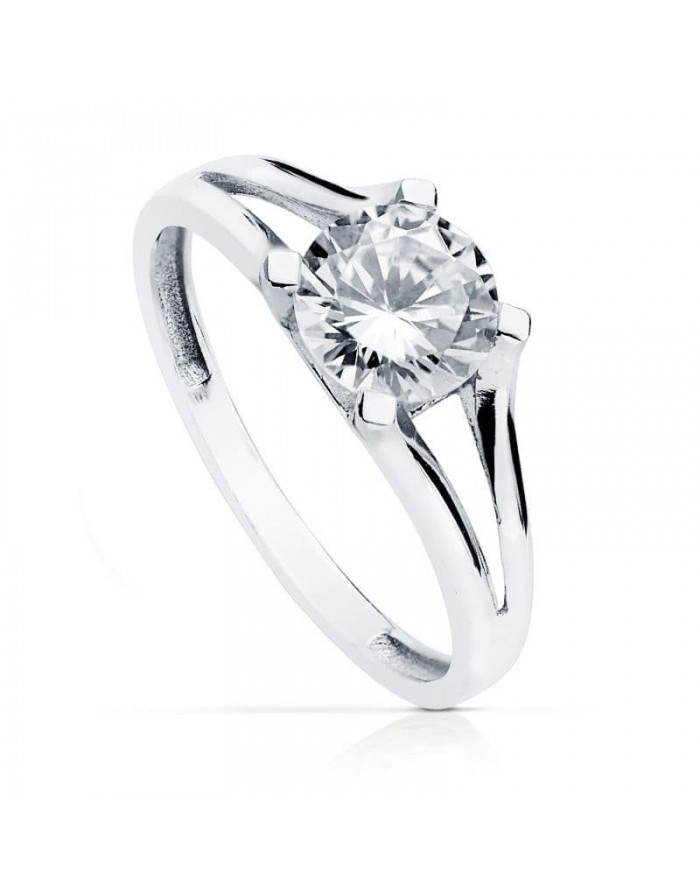 Solitario de Oro Blanco 9KT y acabado pulido de la marca Joyas Armaan . La piedra tiene una talla brillante.