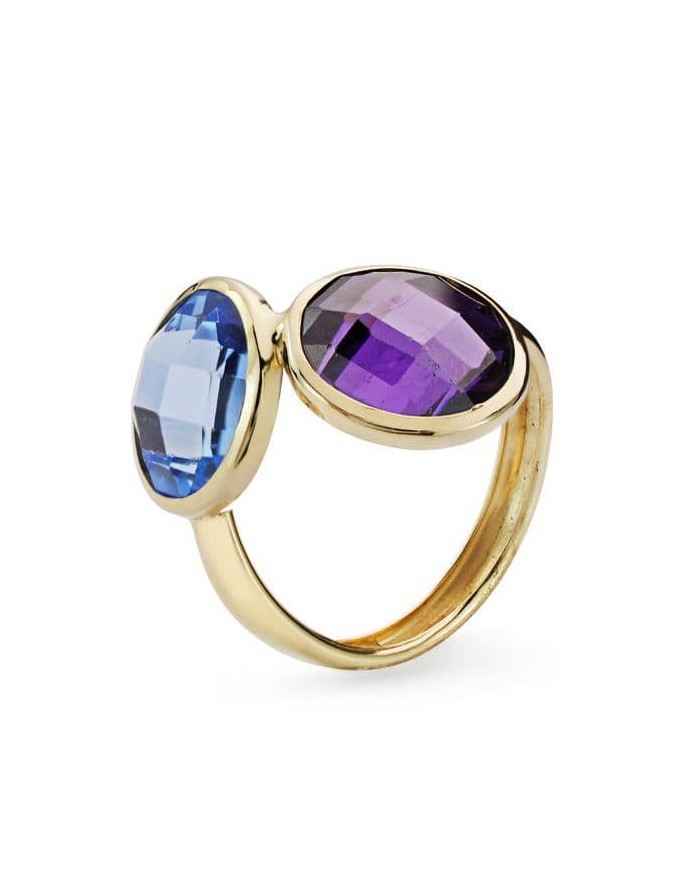 Este original anillo está hecho con dos piedras de colores azuly violeta en talla brillante y engastadasenbocel. El ancho total es de 12 milímetros.