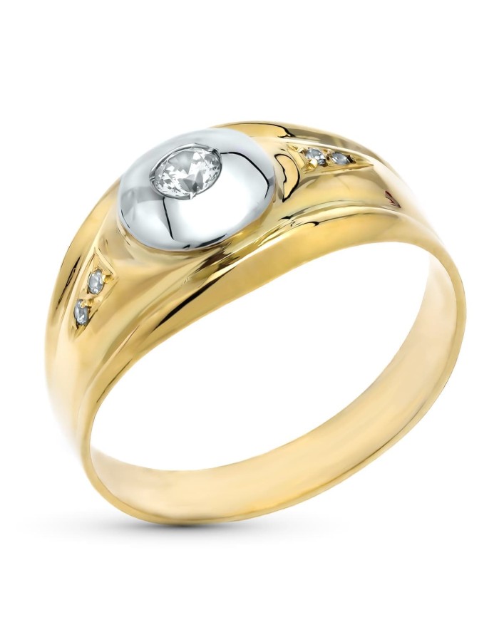 Sortija de Oro Amarillo 9KT y acabado bicolor de la marca Joyas Armaan de 9.5 mm de ancho. La piedra tiene una talla brillante.