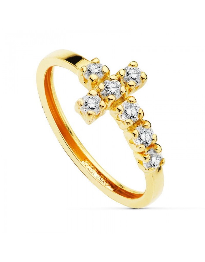 Sortija de Oro Amarillo 18K de la marca Joyas Armaan de 2mm de ancho y diseño de cruz latina.