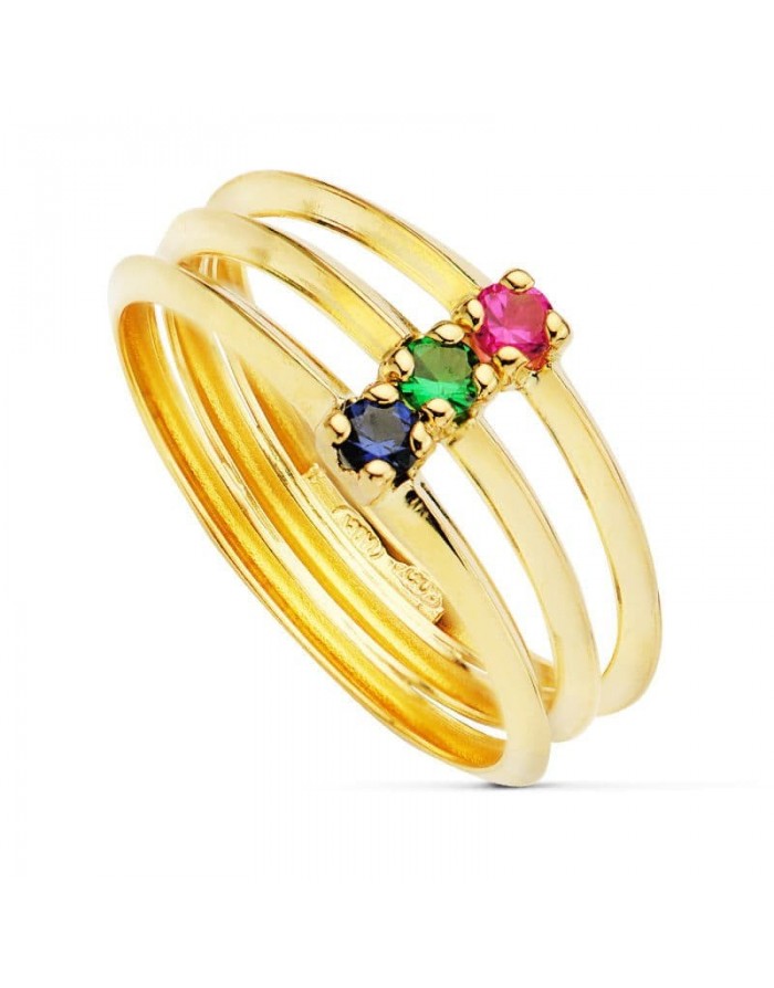 Este anillo está diseñado con tres bandas en Oro Amarillo unidas en su parte central por tres piedras engastadas en 4 garras, en talla brillante y diversos colores.