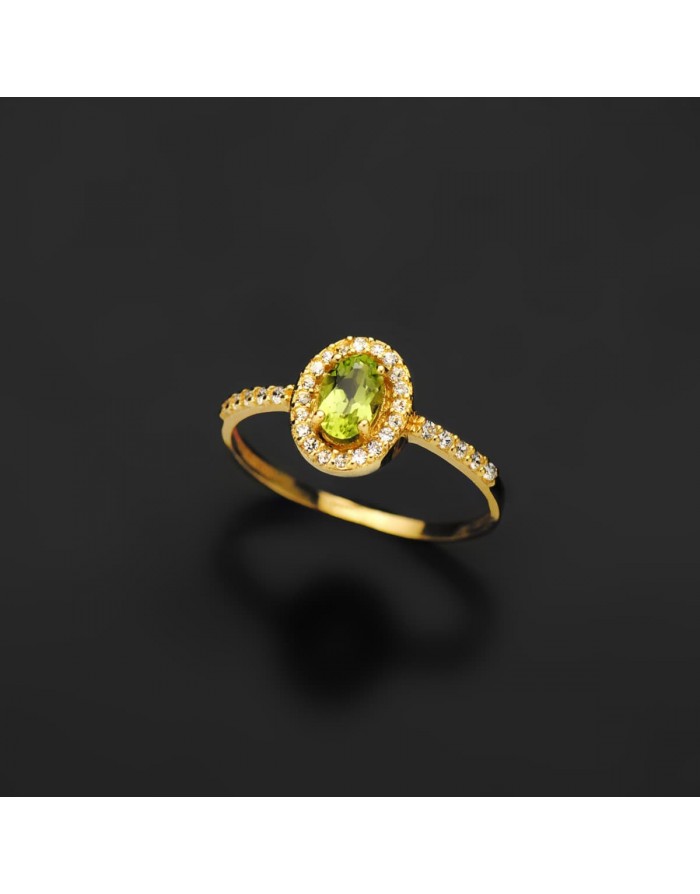 Un anillo engastado en una piedra preciosa, La Olivina, de 0,47 quilates, de dimensiones 6 x 4mm, y en talla oval, coronada con Circonitas en talla brillante engarzadas en 4 garras. La Olivina es la Piedra Mágica en las leyendas y relatos fantásticos de la cultura de Las Islas Canarias.