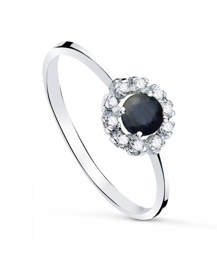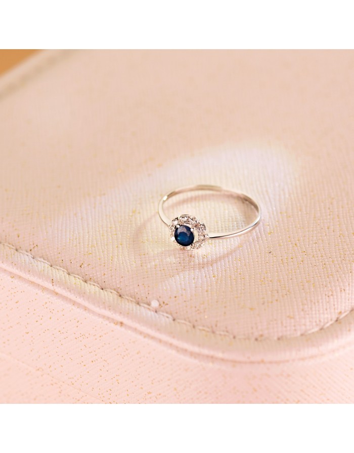 El Zafiro, como una de las gemas preciosas más amadas, es la verdadera estrella en esta pieza de joyería. Tiene un tamaño de 4 mm y un peso de 0,026 quilates. La belleza de este anillo lo acentúa una corona de Circonitas en talla brillante de un diámetro de 7 mm.
