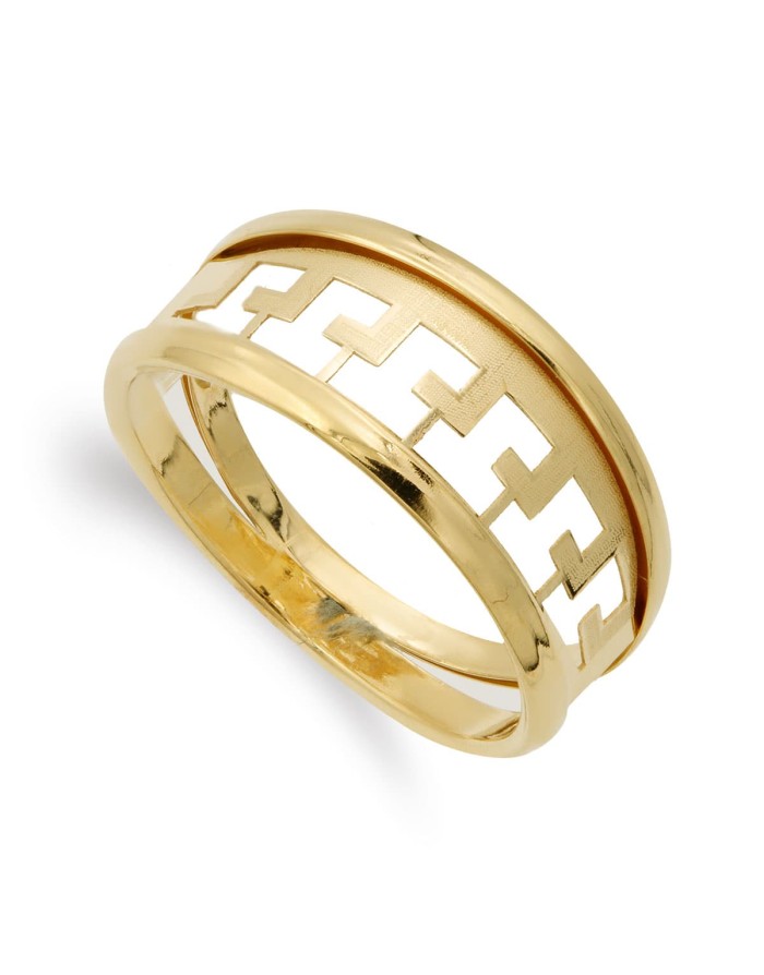 Este precioso anillo ancho está formado por dos hilos de Oro Amarillo de primera calidad unidos y decorado con elementos calados. En su parte más ancha mide 9 milímetros y el ancho del cuerpo es de 4 milímetros.