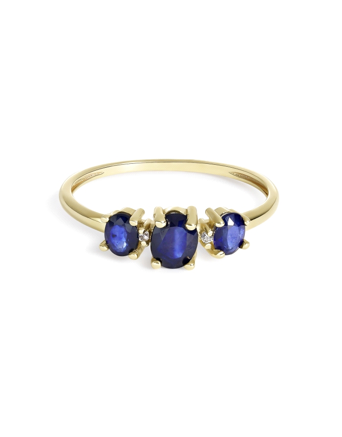 Anillo de tres piedras para mujer con Zafiros y Diamantes montado en Oro Amarillo de 18KT.