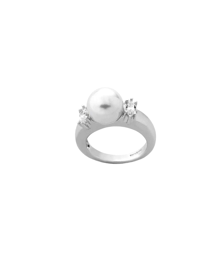 Anillo de Plata de Ley Rodiada con Perla central color blanco. El diámetro de la perla es de 10mm. Le acompaña a esta perla redonda dos Circonitas engastadas en garras redondas y con una TallaMarquesa. Una pieza que será un esencial en tu joyero y que aportarán un plus de elegancia a tu estilo.