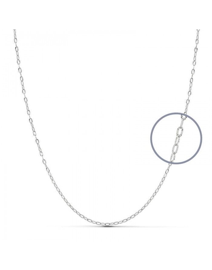 Cadena hecha en Oro Blanco 18KT de la marca Joyas Armaan con cierre de reasa, el largo de la pieza es de 45 cm y tiene un calibre de 1,5 mm.