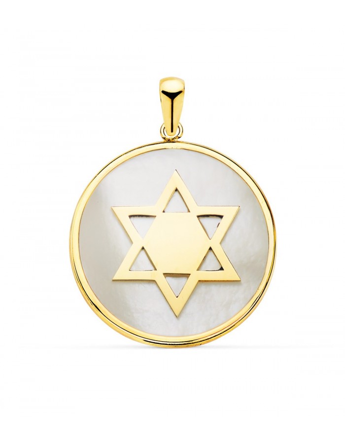 Colgante de Oro Amarillo 18KT con la Estrella de David de la marca Joyas Armaan. La base de este medallón es de nácar y mide 20 mm de diámetro.