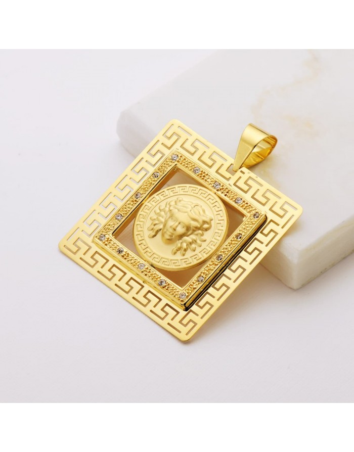 La piedras que adornan a este elegante colgante para hombre y mujer son Circonitas de color transparente. Es una joya donde la protagonista es La Diosa Medusa, símbolo de protección de los espíritus malvados en la mitología griega. Presenta un doble cuadrado, el más exterior con dibujos en Greca. El tamaño del colgante es de 37 x 37 mm., y tiene un peso aproximado de 8,50 gramos.