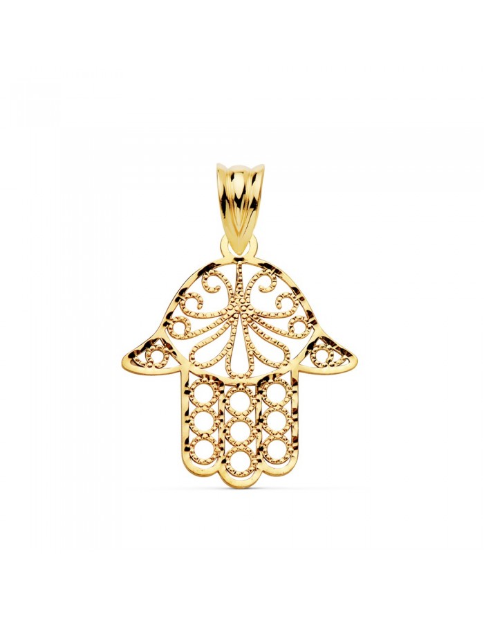 Colgante Amuleto Mano de Fátima Oro 18KT Calados y Ornamentos -20mm