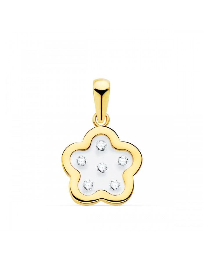 Colgante de Oro Amarillo 18K en forma de Flor de la marca Joyas Armaan. La piedras que la adornan son Circonitas de color Transparentes. Es un colgante especialmente diseñado para mujer.