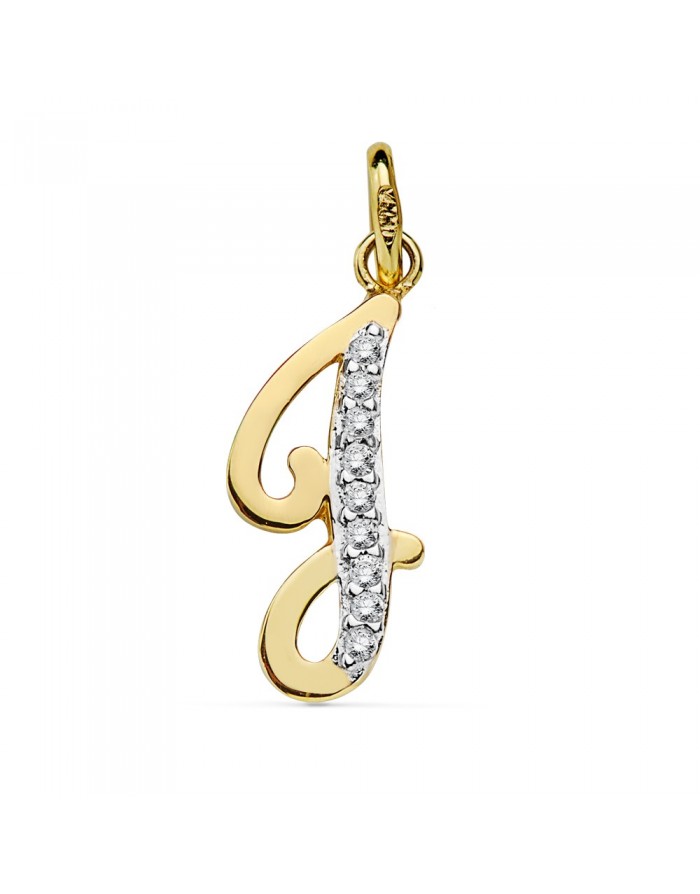 Colgante Inicial J de Oro Amarillo 18KT de la marca Joyas Armaan. Las piedras que la adornan son Circonitas, un contraste de luz y brillo en el diseño de esta Inicial.