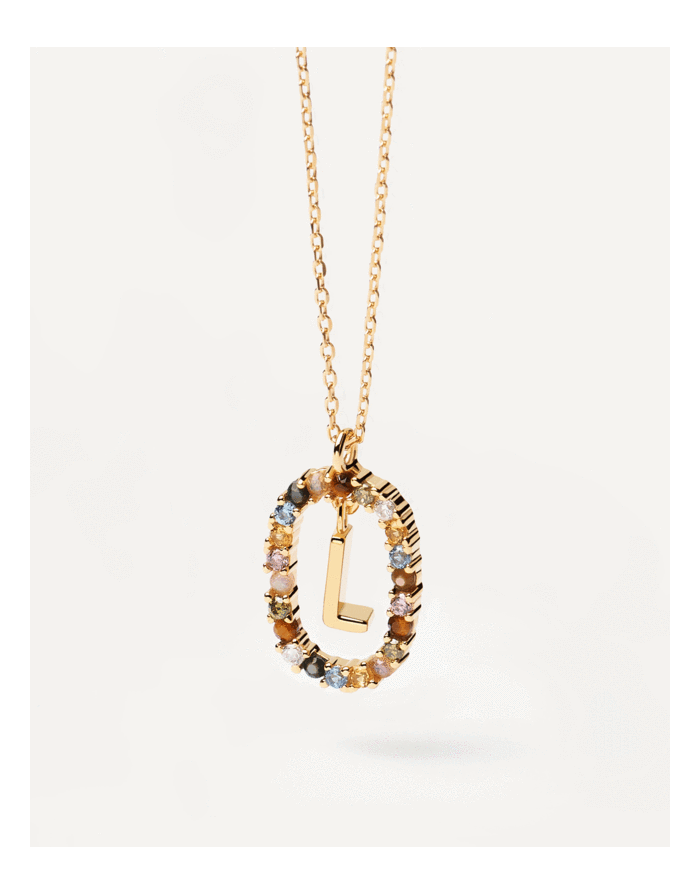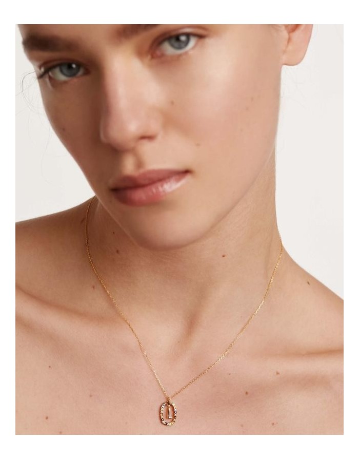 Collar tipo Forzada hecho en plata de 1ªley y con acabado en Baño de Oro de 18Kt de la marca P de Paola con cierre de mosquetón, el largo de la pieza es de 40-50 cm. La piedra de este collar está hecha de semipreciosas de color multicolorEste producto tiene una garantía internacional de 2 años