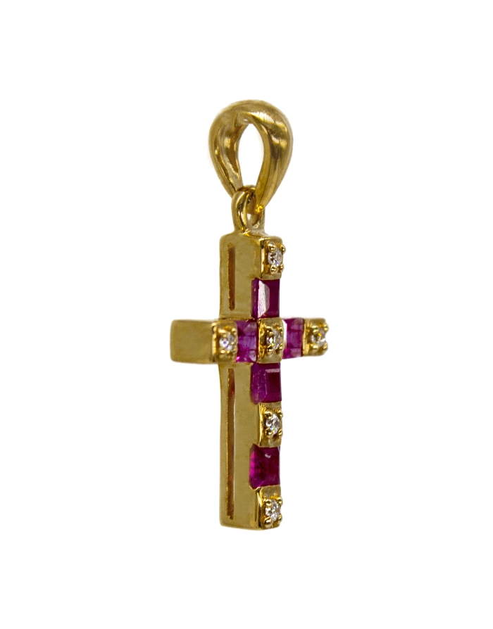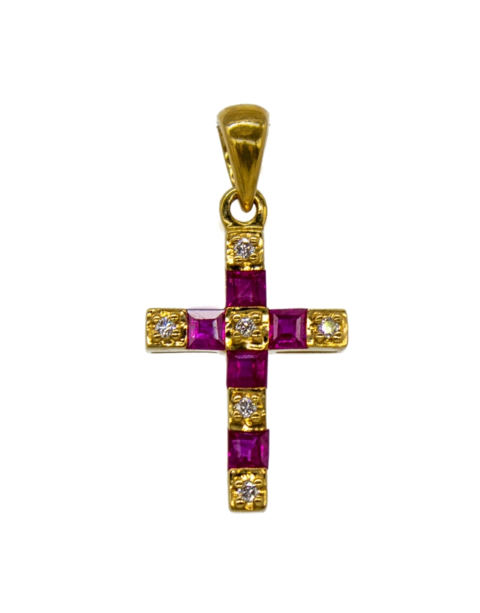 Colgante Cruz de Oro 18K con Rubí y Diamante