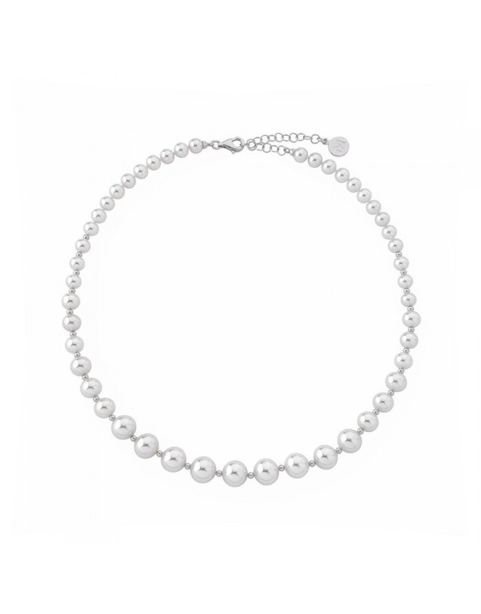 Collar con perlas hecha en Plata de ley y con acabado en Rodio de la marca Majorica con cierre mosquetón redondo, el largo de la pieza es de 43/48cm.