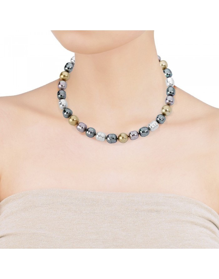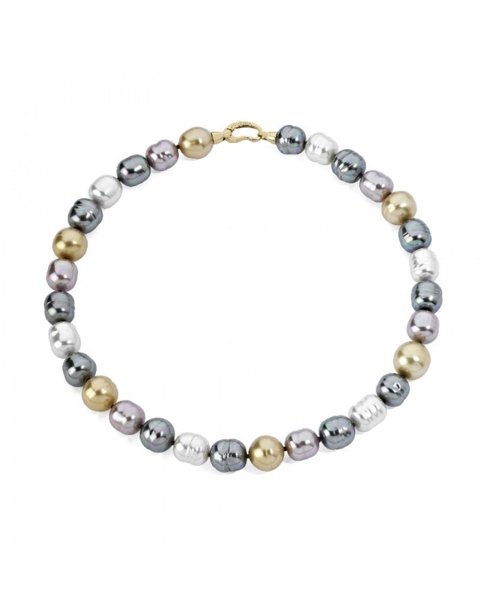 Collar con perlas hecha en Plata de ley y con acabado en Baño de Oro de 18Kt de la marca Majorica con cierre mosquetón redondo, el largo de la pieza es de 46 cm. Este producto tiene una garantía internacional de 10 años