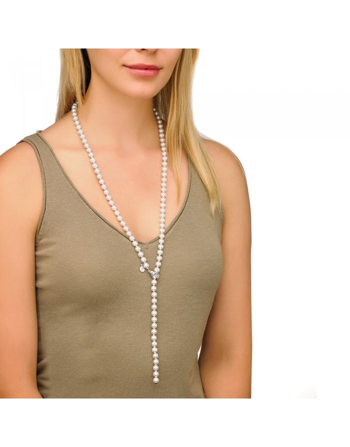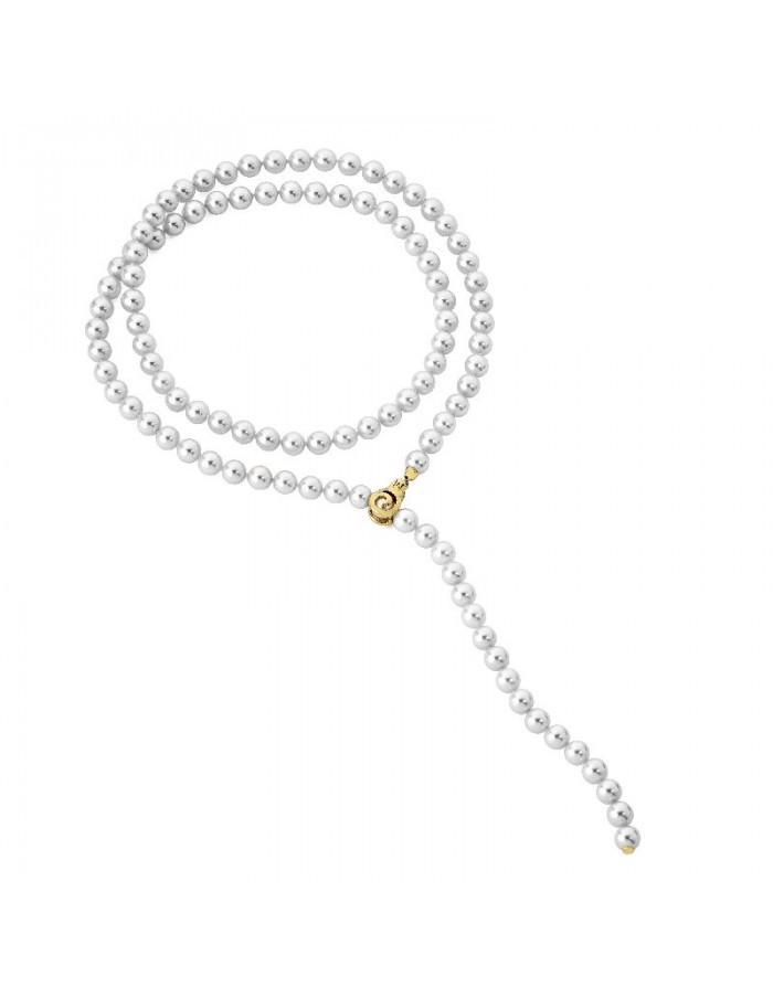 Collar con perlas hecha en Plata de ley y con acabado en Baño de Oro de 18Kt de la marca Majorica con cierre de clip ajustable, el largo de la pieza es de ajustable max 90cm. Este producto tiene una garantía internacional de 10 años