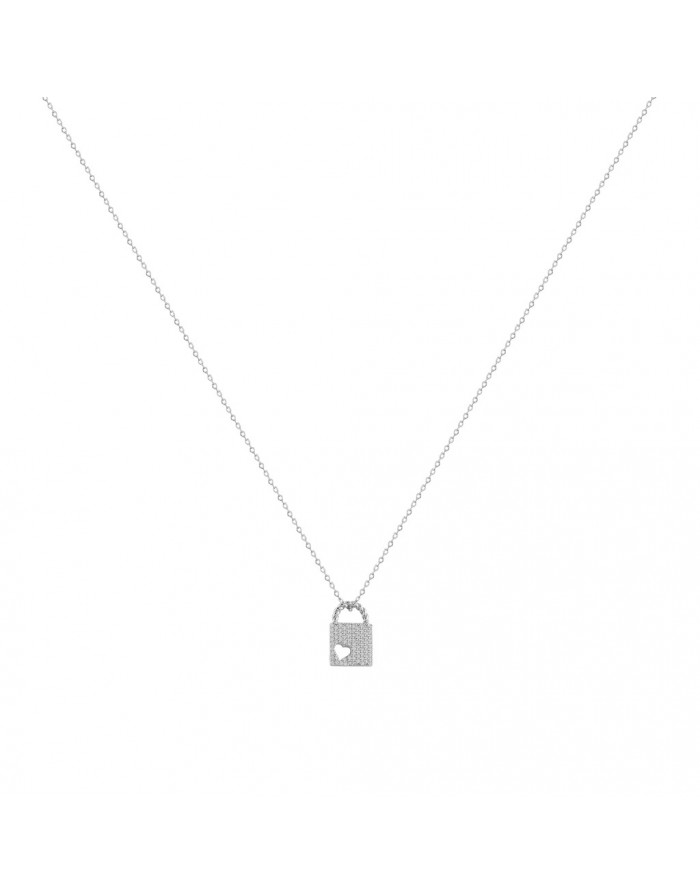 La gargantilla está formada por una cadena plateada y una colgante con forma de candado cubierto de circonitas. El largo del collar es de 45 cm extensible hasta 50 cm. Tiene un cierre de mosquetón ajustable.