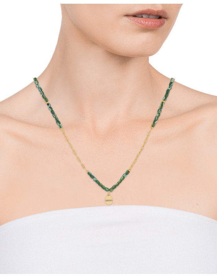 Collar tipo Forzada hecho en Plata con Baño de Oro y con acabado en Brillo-Pulido de la marca Viceroy con cierre de mosquetón ajustable, el largo de la pieza es de 42 + 3cm. La piedra de este collar está hecha de madreperla de color verde