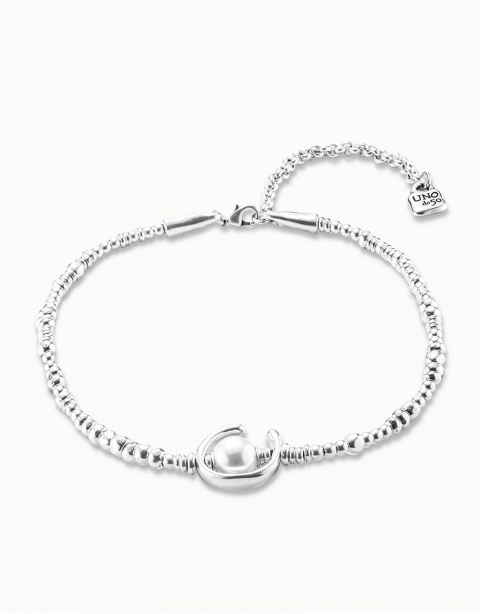 Collar con perlas hecha en metal con baño de plata de la marca UNOde50 con cierre de mosquetón ajustable, el largo de la pieza es de 45 cm.