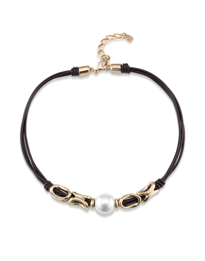 Collar de 4 tiras de Cuero con Perla y eslabones bañados en Oro