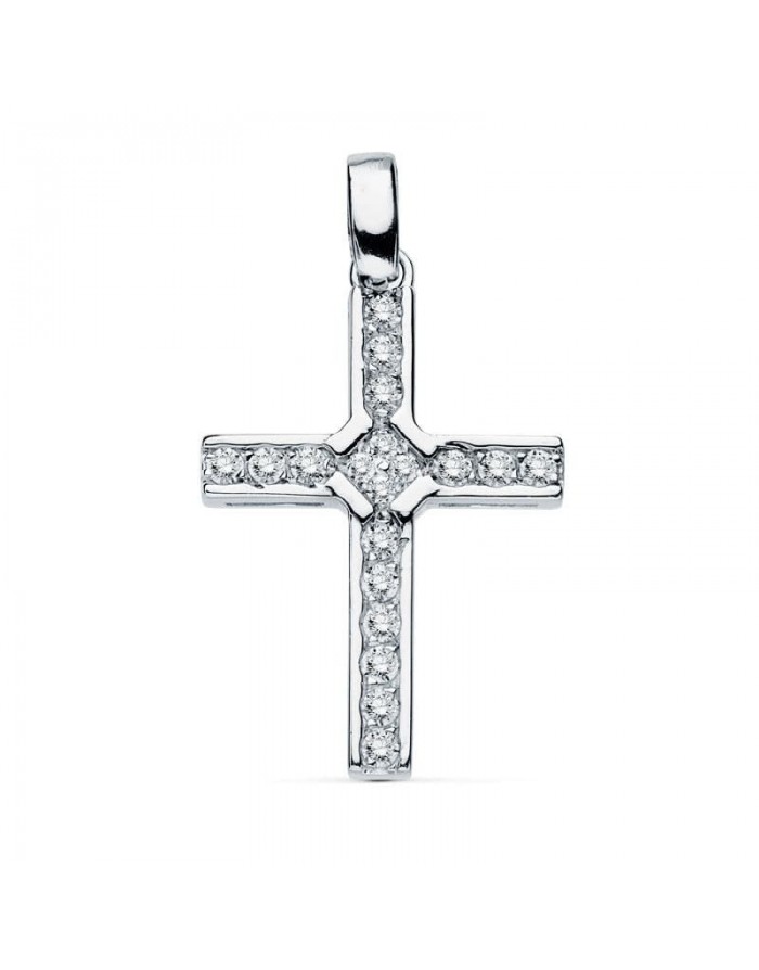 Cruz de Oro Blanco 18KT con un acabado pulido de la marca Joyas Armaan con Circonitas aportando un brillo espectacular a esta hermosa joya religiosa.
