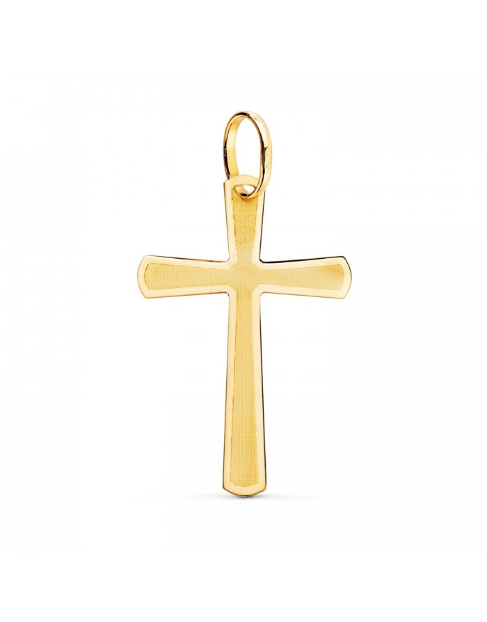 Elegante Cruz Latina con un diseño plano. Una joya realizada en Oro de primera calidad, cuya combinación de su acabado en brillo y mate, confieren a este colgante en forma de cruz un aspecto único. Tiene unas medidas de 25 mm de alto y 16 mm de ancho.