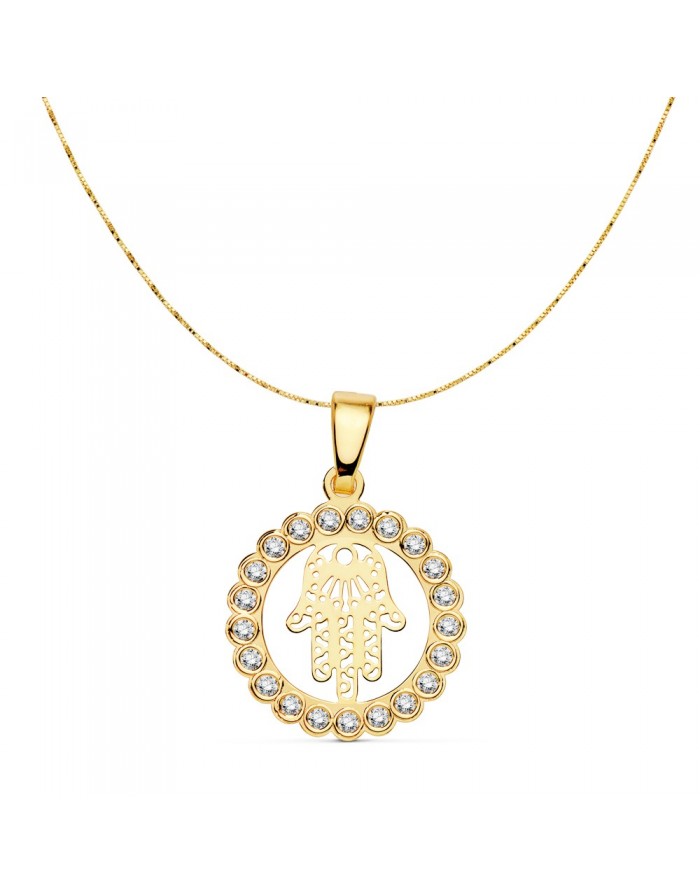 Colgante y cadena veneciana Mano de Fátima y circonitas hecho en Oro 18Kt