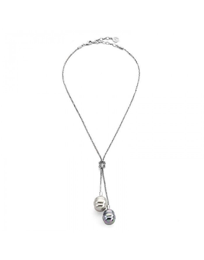 Gargantilla de perlas de Plata de ley de la marca Majorica. Esta Gargantilla tiene cierre de de mosquetón y 42 cm con extensión a 47 cm de largo. Además, esta pieza joyería está hecha perlas barroca de color gris, nauge y un diámetro de 14 mm. Es una gargantilla diseñada especialmente para mujer.