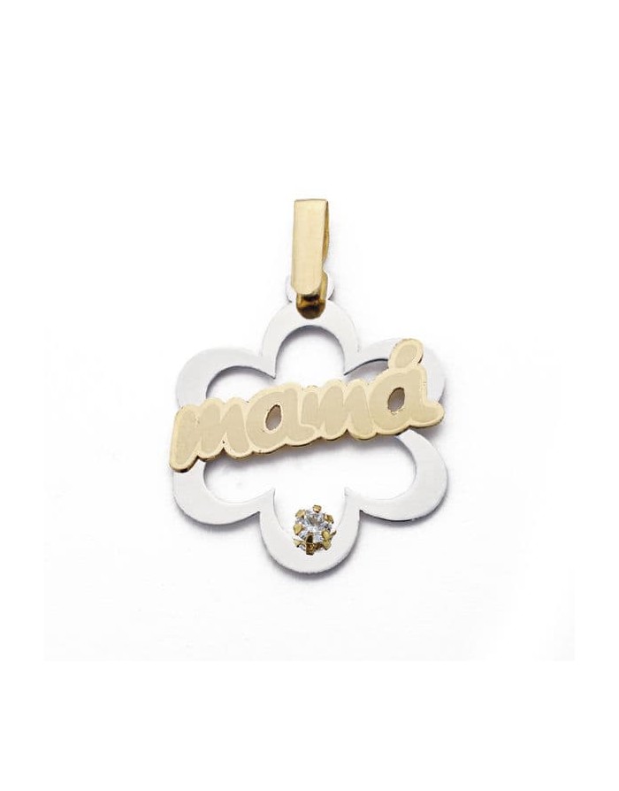 Colgante en forma de flor y la palabra mamá hecho de Oro Amarillo de 9KT y Oro Blanco de 9KT con una Circonita engarzada en garras.