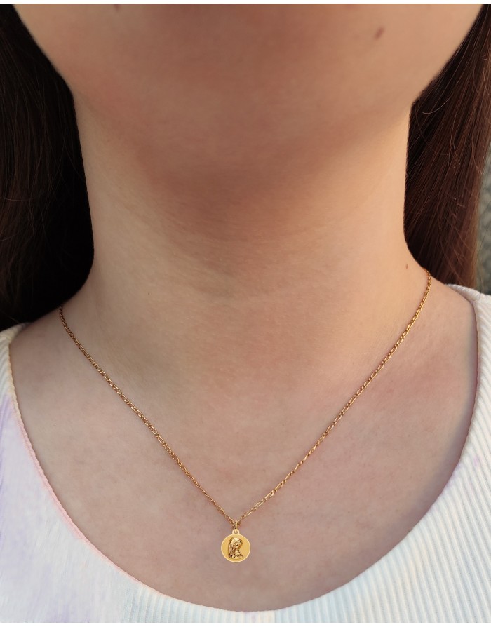 Su medida es de 14 milímetros de diámetro. Una medalla de Oro de Oro de primera calidad, resaltando en su diseño la imagen de perfil de La Virgen Niña en brillo y sobre un base matizada. Un regalo perfecto que podrás personalizar para momentos inolvidables como la 1ª Comunión, Nacimiento.
