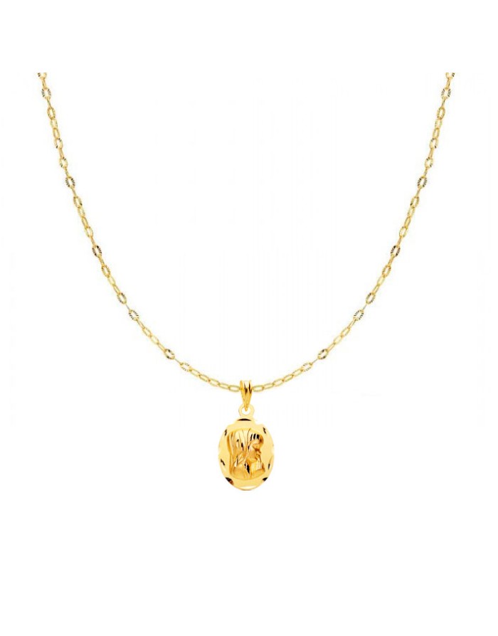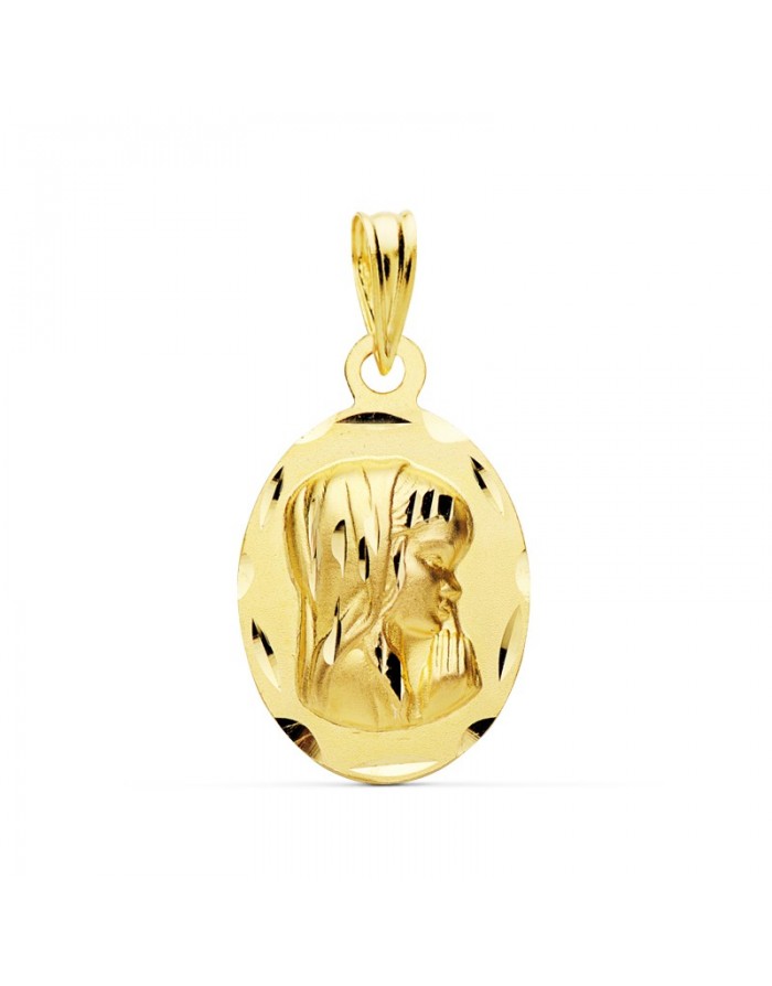 Medalla con la figura de La Virgen Niña y forma oval en Oro Amarillo de 18 kilates (750 milésimas) de la marca Joyas Armaan. La medalla tiene 19 mm. de alto y 12 mm. de ancho.