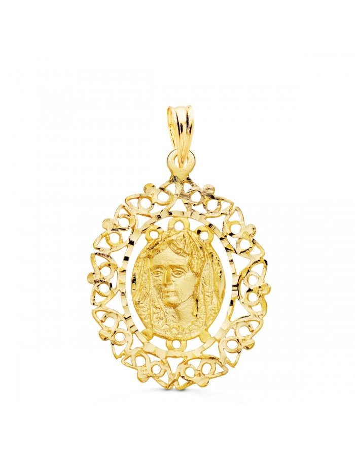 Medalla Virgen de La Macarena Cerco Filigrana Oro de 18Kt -28 x 21mm