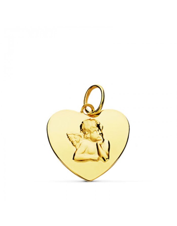 Colgante Medalla de Oro Amarillo 18KT en forma de Corazón con la figura en relieve de Ángel Burlón de la marca Joyas Armaan. Mide 14 milímetros y tiene un acabado pulido.