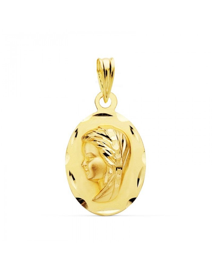 Medalla con figura de la Virgen Niña tallada en Oro de 18KT de la marca Joyas Armaan. Tiene forma oval y un acabado matizado en toda la base, destacando el tallado en hoja en todo su perímetro. La medalla mide 22 mm de alto y 14 mm de ancho y un peso de 1,40 gramos.