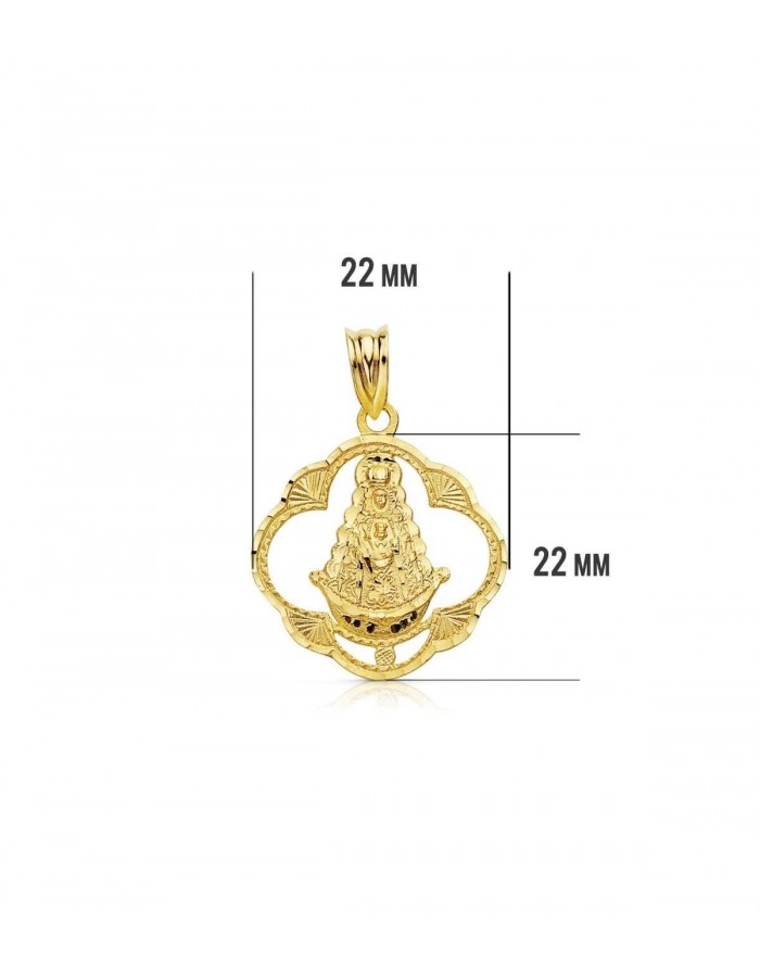 Medalla con figura de La Virgen del Rocío en Oro Amarillo de 18KT de la marca Joyas Armaan. La medalla mide 22 mm de alto y 22 mm de ancho. Los acabados de la Virgen son en brillo y mate y el cerco calado de tipo pandereta tiene un acabado pulido.