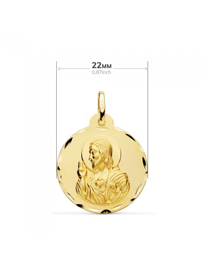 Esta medalla tiene las dos figuras religiosas talladas en relieve. La base es matizada y presenta un tallado en brillo en el borde.