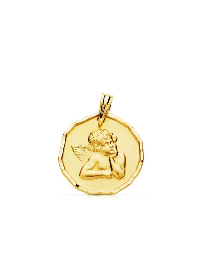 Medalla para Bebé hecha de Oro Amarillo de 9KT con borde en relieve y figura de Ángel Querubín de perfil. Mide 16 milímetros, un tamaño ideal como regalo para un bebé en su Nacimiento/Bautizo o cualquier otra celebración. No olvides personalizar esta joya con Nombre y/o Fecha por detrás.