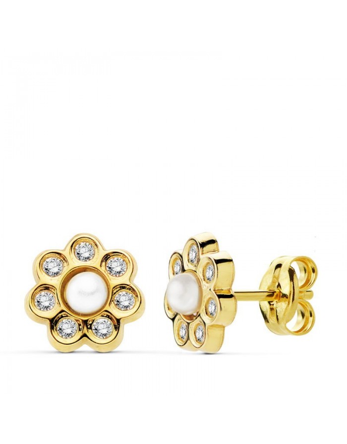 Pendientes en Oro 18kt con pétalos de circonitas y perla central blanca