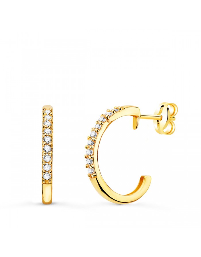 Pendientes en forma de Aro hechos con Oro Amarillo 18K de la marca Joyas Armaan con cierre a presión. La piedra del pendiente es circonitas de color transparente.