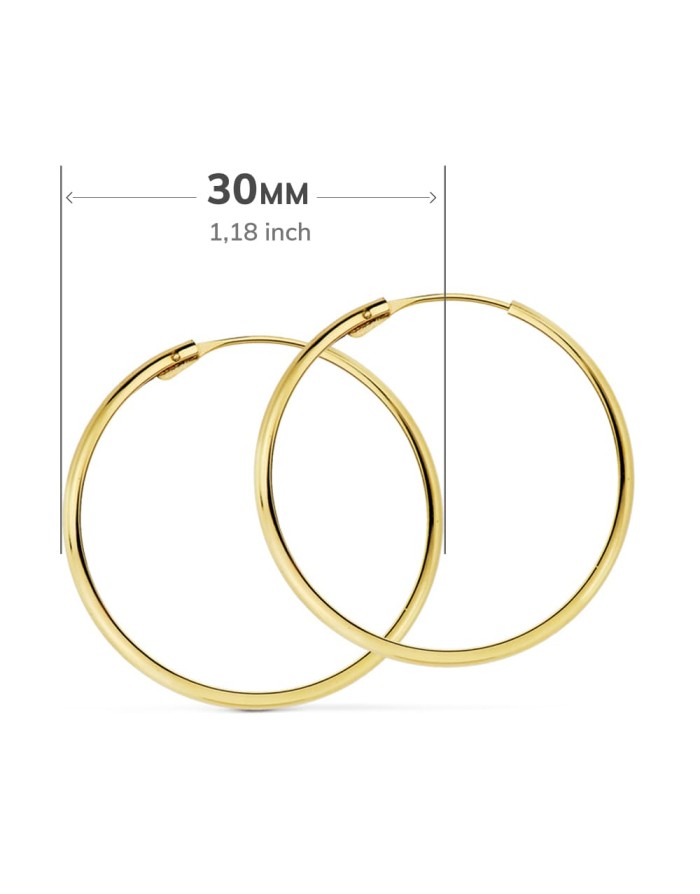 Pendientes de Aro para mujer hechos en Oro Amarillo de 18KT de la marca Joyas Armaan. Aros de media caña, lisos, huecos y ligeros cómodos de llevar. Versátiles estos aros de primera calidad y tamaño grande 30 milímetros de diámetro, 3 milímetros de grosor.