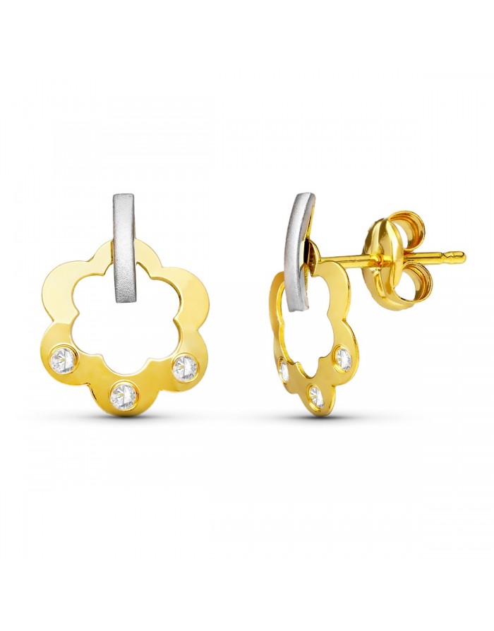 Pendientes Banda en Oro Blanco y Flor con Circonitas en Oro Amarillo de 18kt -11 x 8mm