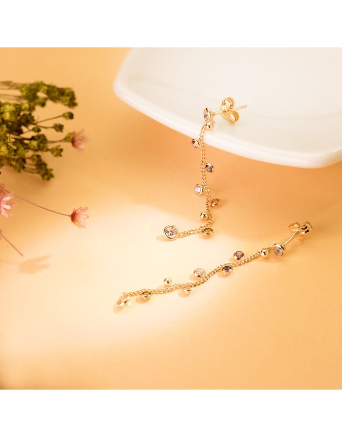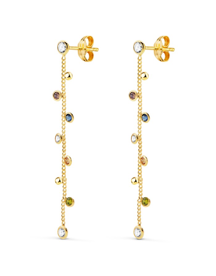 Pendientes largos de mujer en Oro de 18 quilates de alta calidad lo que les garantiza una gran resistencia y durabilidad. La cadena es fina y delicada, con un elegante acabado pulido. Las circonitas de colores están colocadas a lo largo de la cadena, creando un efecto llamativo y vibrante. Los pendientes tienen un cierre de presión, lo que los hace muy fáciles de poner y quitar. Miden 45 mm.