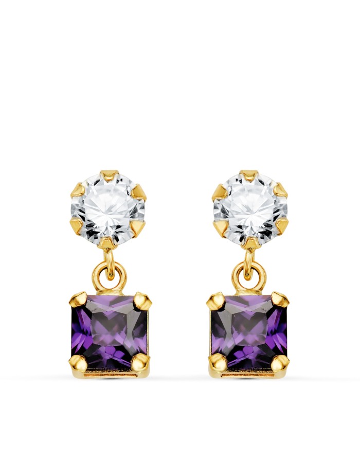 Pendientes hechos de Oro Amarillo 18KT de la marca Joyas Armaan con cierre a presión. La piedra del pendiente es circonita y amatista de color .
