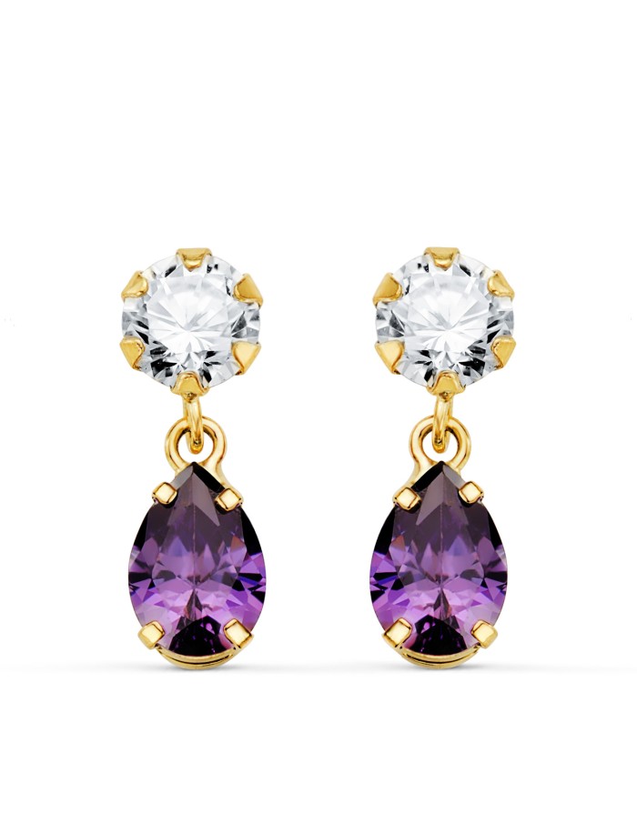 Pendientes hechos de Oro Amarillo 18KT de la marca Joyas Armaan con cierre a presión. La piedra del pendiente es circonita y amatista de color .