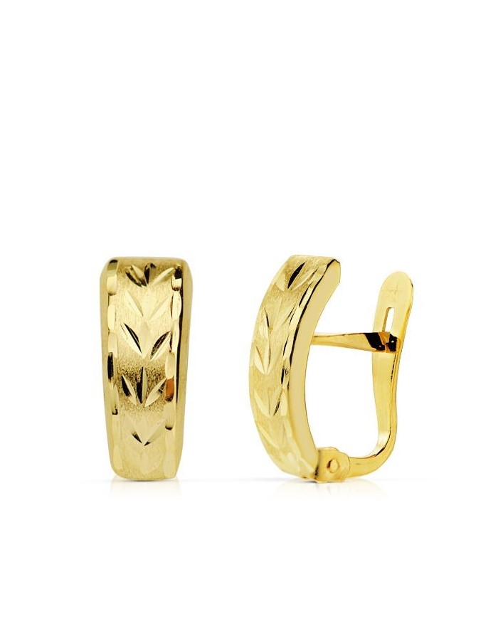 Pendientes de forma ovalada, fabricados en Oro Amarillo 18KT con un acabado de diamantado, ideales para la mujer y perfectos para eventos de Comunión. Cuentan con un cierre tipo catalán que asegura su comodidad y firmeza. Estos elegantes pendientes destacan por su superficie tallada a mano, aportando un toque de sofisticación y elegancia.