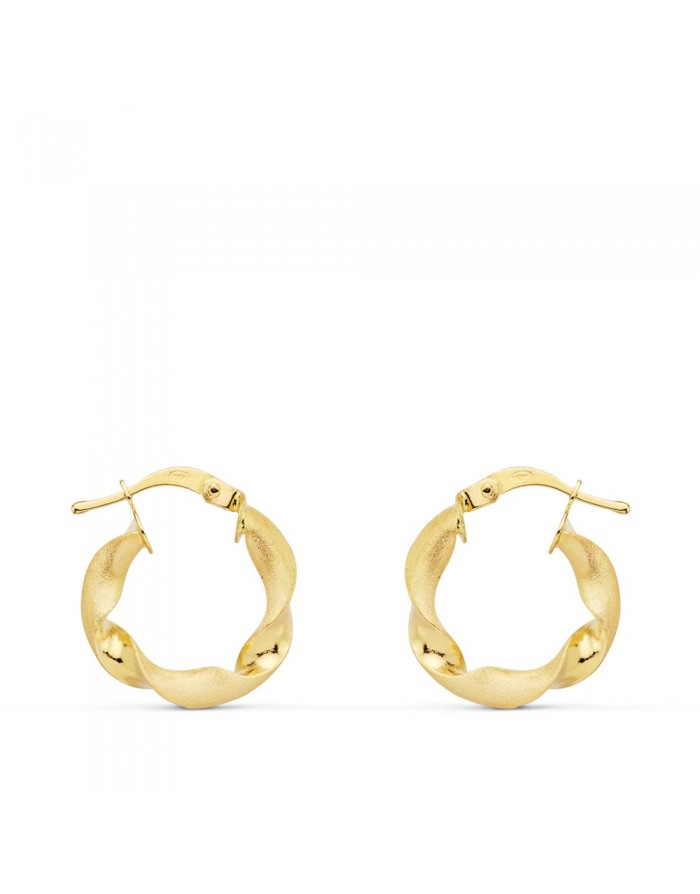 Pendientes de forma Aro, fabricados en Oro Amarillo 18KT con acabado mate y brillo, para mujer, ideales para uso diario. Con un diseño de líneas sinuosas y suaves, estos aros de 17mm de diámetro aportan elegancia y sofisticación a cualquier look. Su cierre Italiano garantiza la comodidad y seguridad durante el uso.
