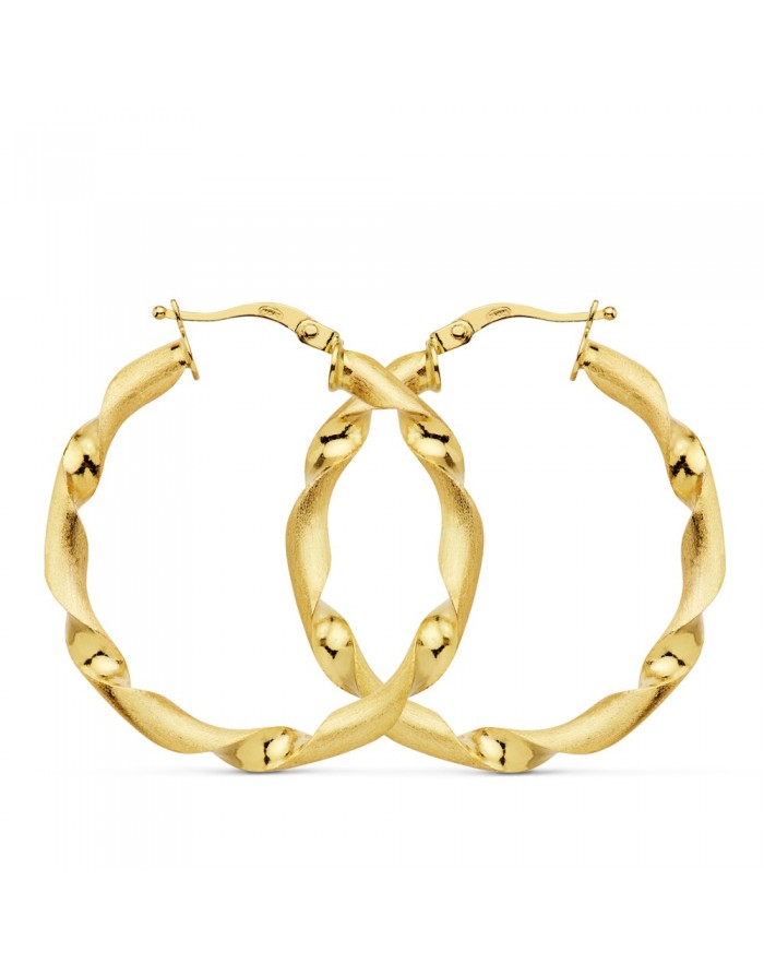 Estos elegantes Pendientes de Oro Amarillo 18kt con un diseño twist combinan un acabado mate y brillante, creando un efecto visual sofisticado y llamativo. Con un diámetro de 31mm, estos pendientes de aro destacan por su cierre italiano, asegurando un ajuste cómodo y seguro.