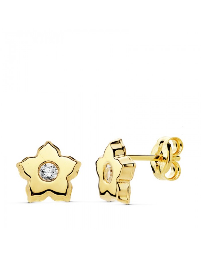 Pendientes de forma Estrella, fabricados en Oro Amarillo 18KT con acabado bicolor, para mujer. Estos pendientes cuentan con una circonita central que aporta un sutil brillo. Gracias a su diseño en forma de estrella, son una opción elegante y sofisticada que puede llevarse en cualquier ocasión.
